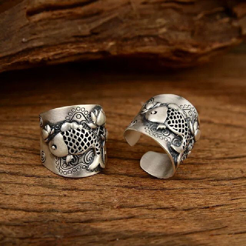 新商品のレトロな森系の鯉のハスの指輪の女性のシンプルなファッションの泰銀は古い筋目の潮流の口の指輪をします。
