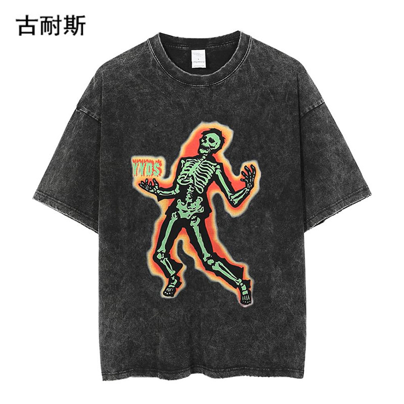 クロスボーダーの卸売りは水洗いして古い重ポンドの半袖の純綿のプリントのtシャツの男性のゆったりしているinsの潮流の復古の服の潮流をします。