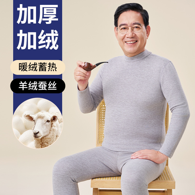カシミヤシルク半高襟保温下着セット中高年ベルベット厚手秋衣秋ズボン発熱保温セット