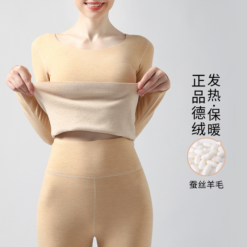 秋冬の女性のカシミヤのシルクの保温スーツの縁を包んで、厚い保温の下着をプラスします。
