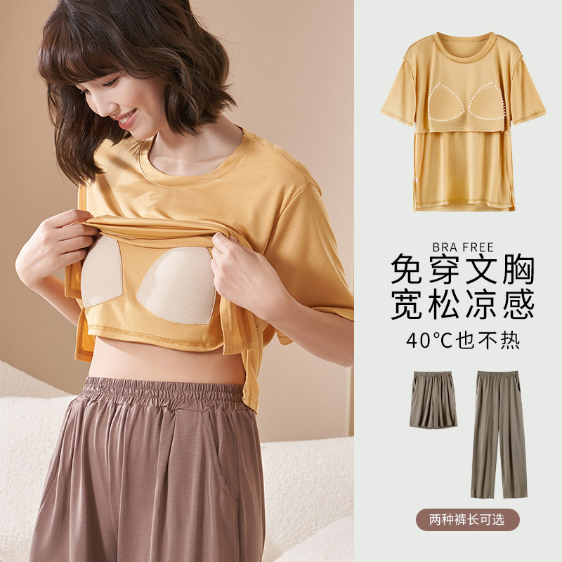 パジャマホーム服セット半袖ショートタイプは胸パッドカップ一体式スチールリングなしで、薄くて通気性があります。
