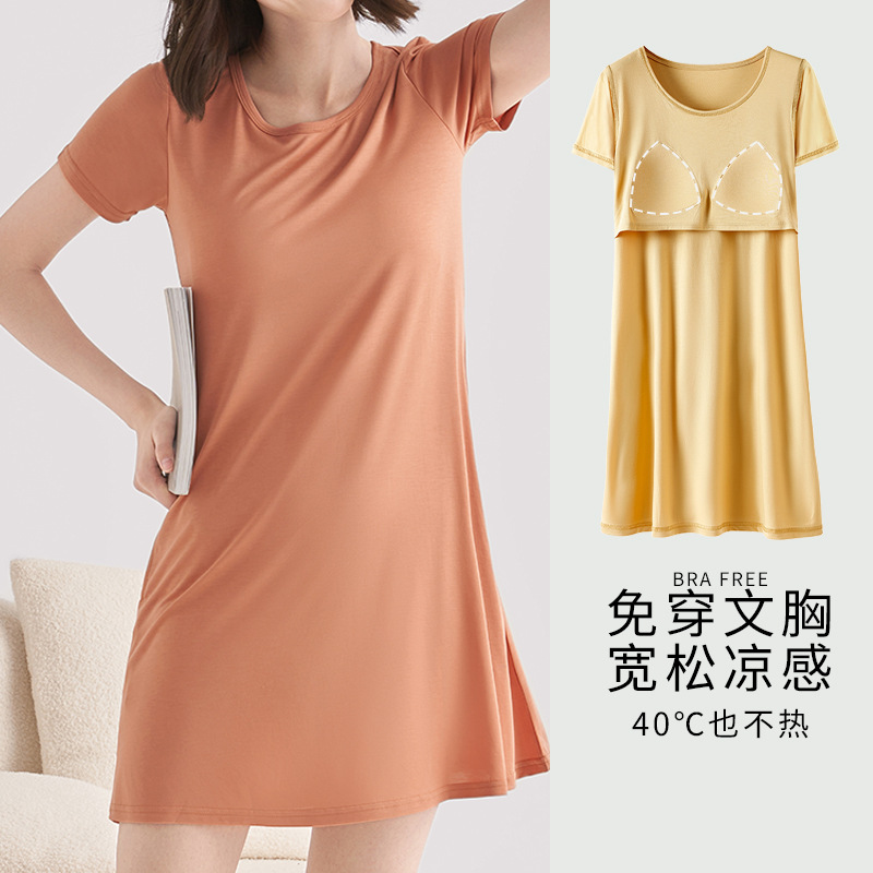 パジャマルームウェア半袖tシャツミディアムロング胸付クッションカップ一体式スチールリングなし薄手通気外着