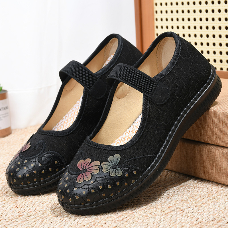 新しい女性の民族風の刺繍の靴の中で老年の平底の柔らかい底の浅い口の通気性の奥さんの靴のミルクの靴のお母さんの靴