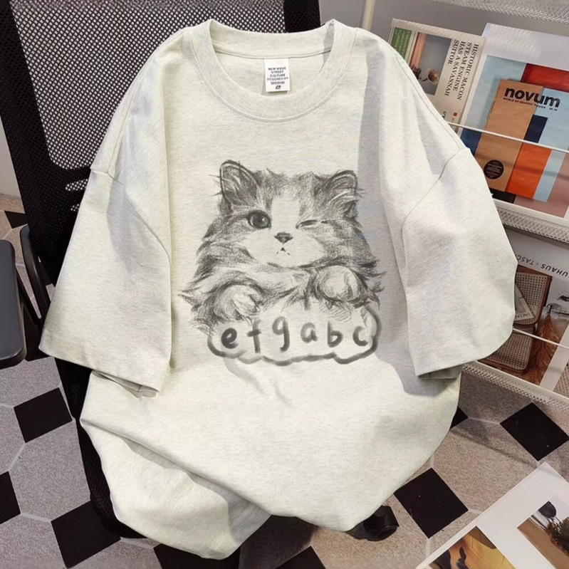 重ポンド純綿猫プリント半袖男性夏tシャツ五分袖ゆるい丸首カップルtシャツ上着