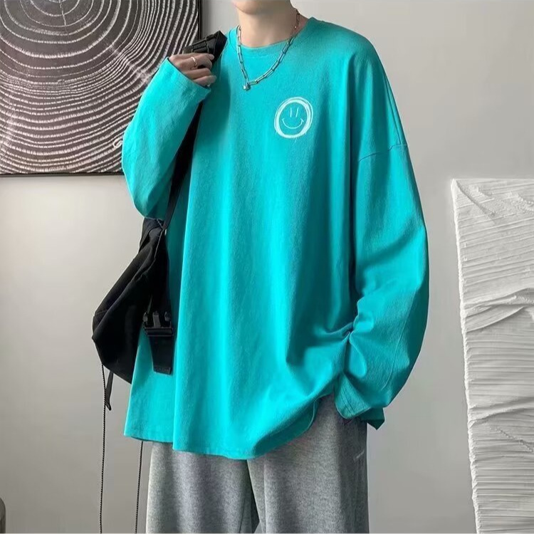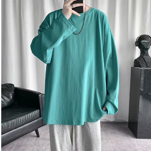 純色丸首tシャツ男性長袖潮牌ins港風百合上着春秋基礎ゆるいカジュアルシャツ