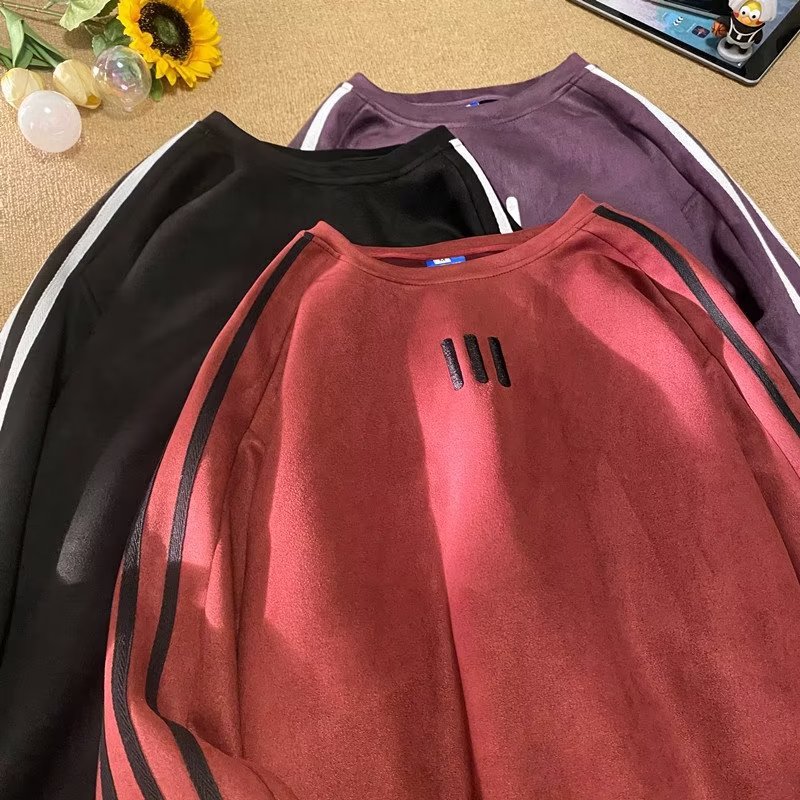 鹿の毛皮の絨毯はストライプの丸首の衛衣の男性の春秋の新型の高い街の運動の上着の香港風のカジュアルなゆったりしているコートをつなぎ合わせます。