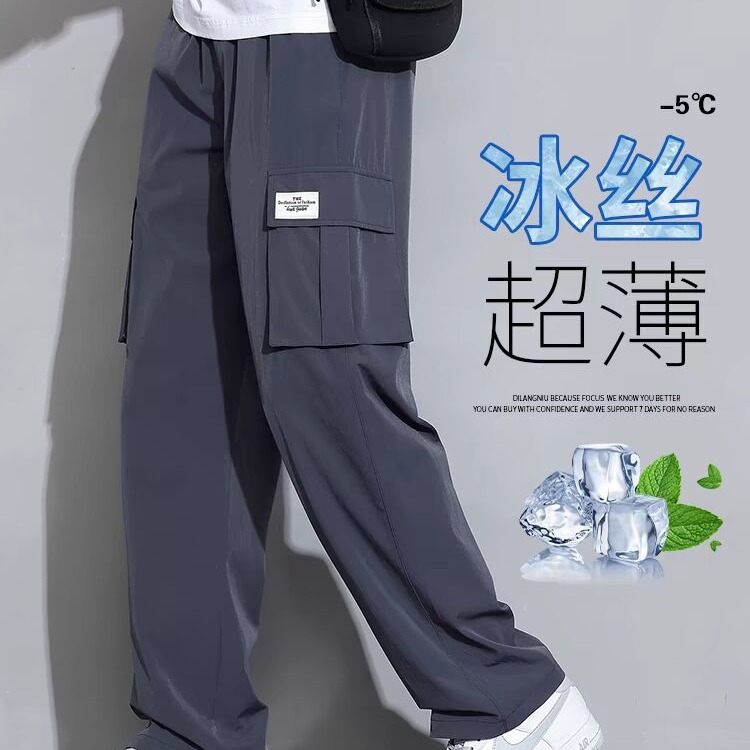 氷の糸の工装のズボンの男性の夏の薄いタイプのアメリカのファッションのブランドのゆったりしているストレートな筒の垂直感の運動のカジュアルな長いズボンの速乾のズボン