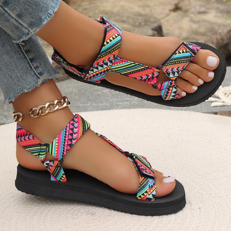 クロスボーダーの外国貿易の大きいサイズ2025夏の新型の厚い底の布の民族の風の女性の靴は色のマジックを合わせてビーチのサンダルを貼ります。