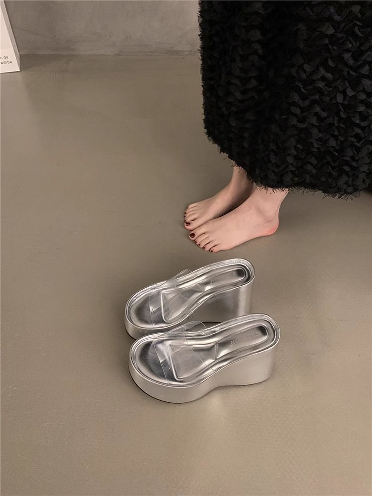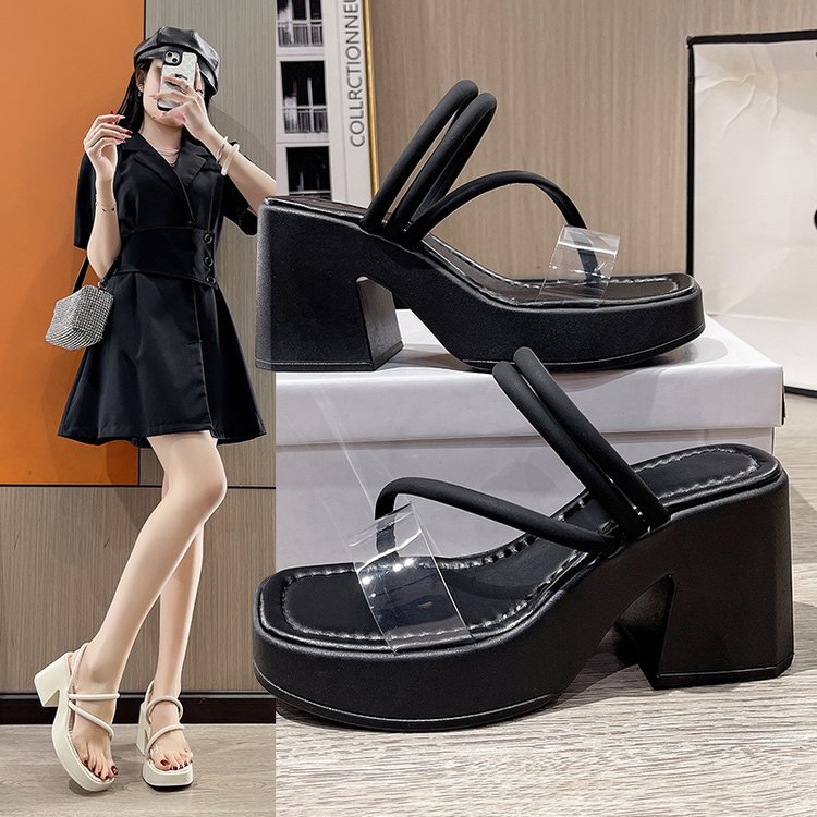 2024夏の新しい女性靴はシンプルで透明な靴の表面の一字型の四角いハイヒールのスリッパの女性です。