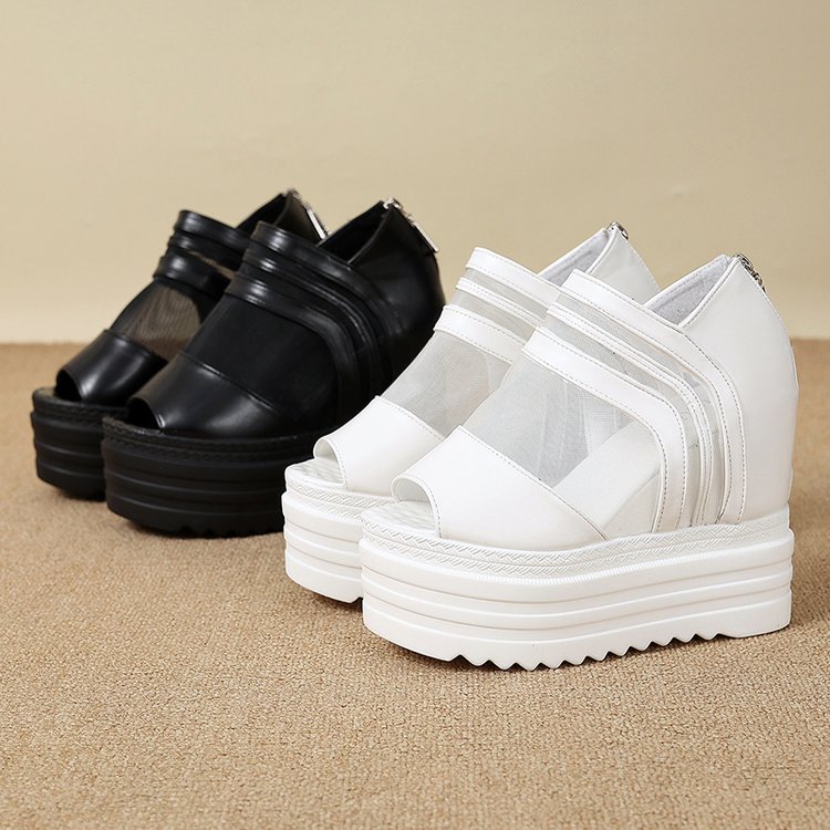 厚い底の松餅のサンダルの女性の夏のセクシーな魚の口の網の糸の中で靴のファッションの後でファスナーの超ハイヒールのサンダルの潮を増加します。