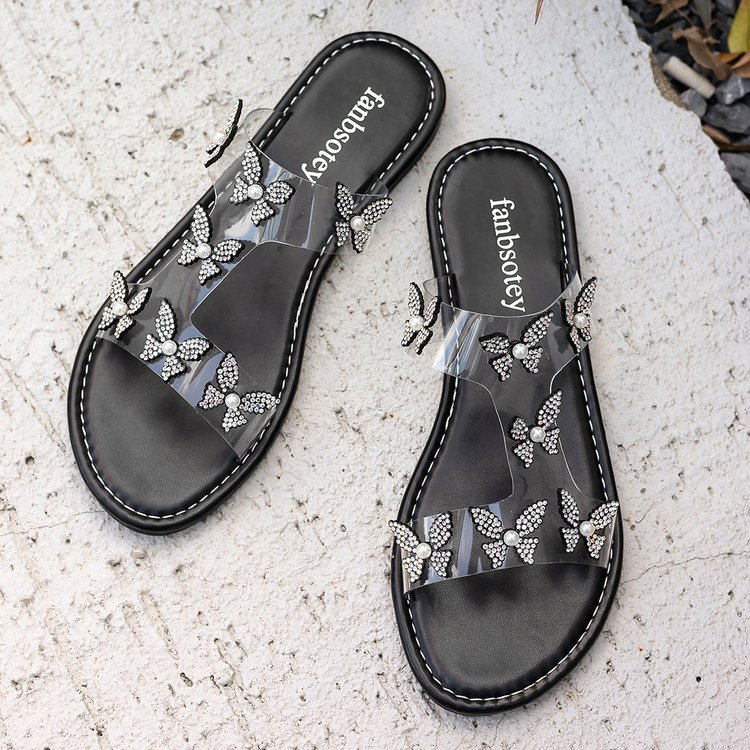 クロスボーダーの大きいサイズの対外貿易の2024夏の新型のファッションの平底の女性の靴は足を挟んで快適にビーチのサンダルに合います。