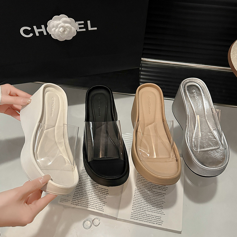 透明なハイヒールの厚い底の1字のスリッパの女性の外は2024の新型の夏の銀色の高くなる坂と砂浜の涼しさを着ます。