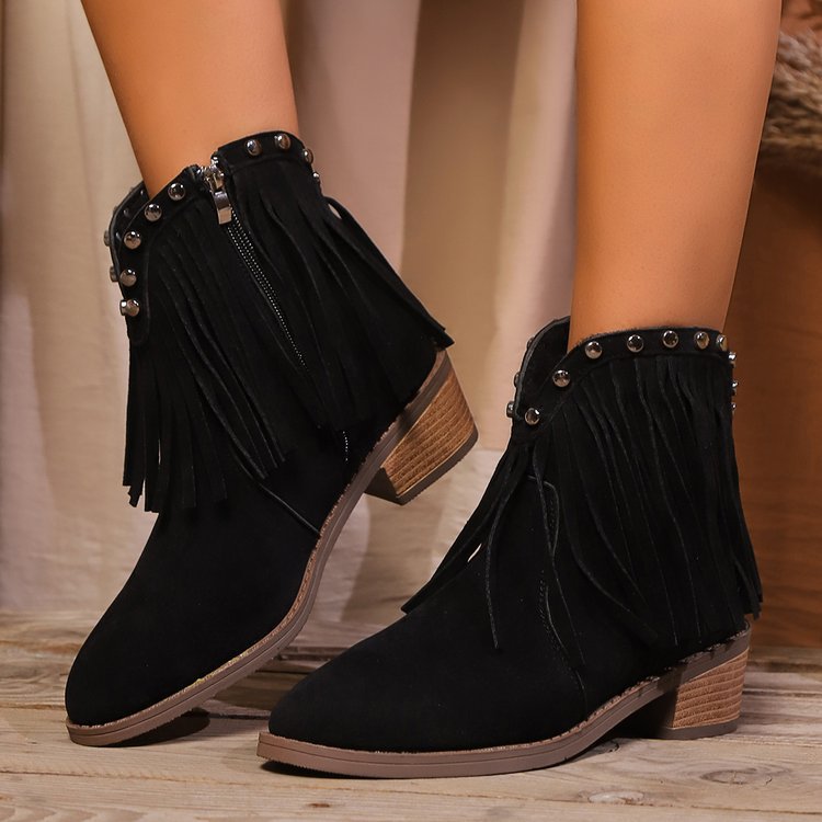 2024秋冬の韓国版の新型の小さい方の頭の方と女性の靴の平底のフリンジの靴のスエードの柳の釘の低い筒のフリンジの靴