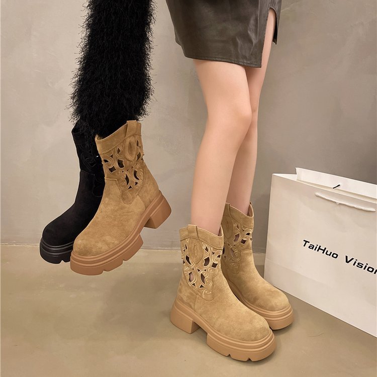 2024夏の秋の新型レトロ西部のデニムのショートブーツの透かし彫りの通気性が高くなります。