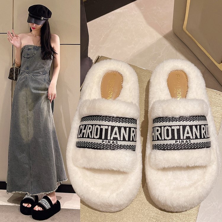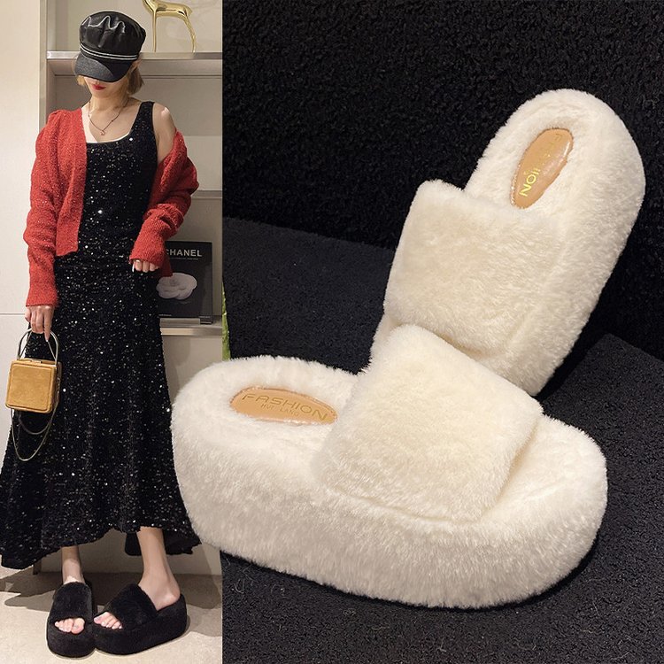韓国版ファッション坂とスリッパ女2024新厚パイル一字毛スリッパ ~ 秋冬は8cm綿引きを着ている