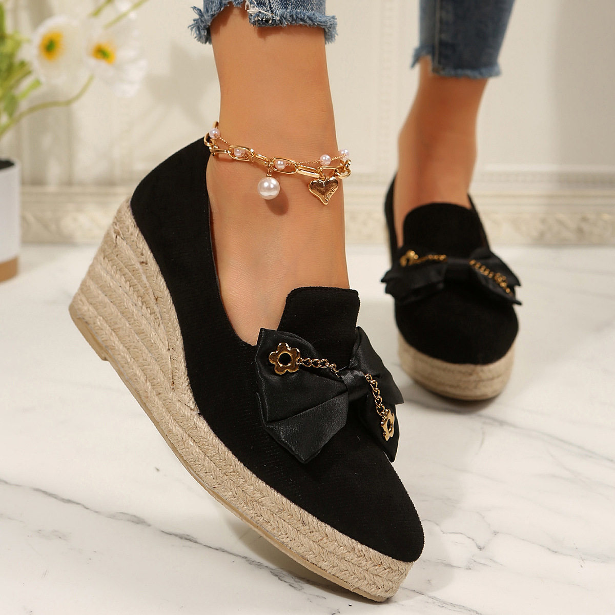 欧米の坂と浅い口の先の靴の女性の蝶結びの厚い底のハイヒールの草は麻の縄の底を編んで速達で現物の卸売りを売ります。