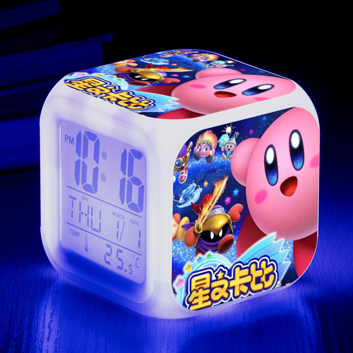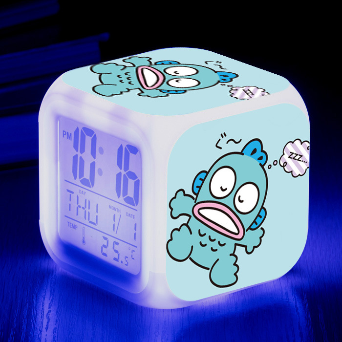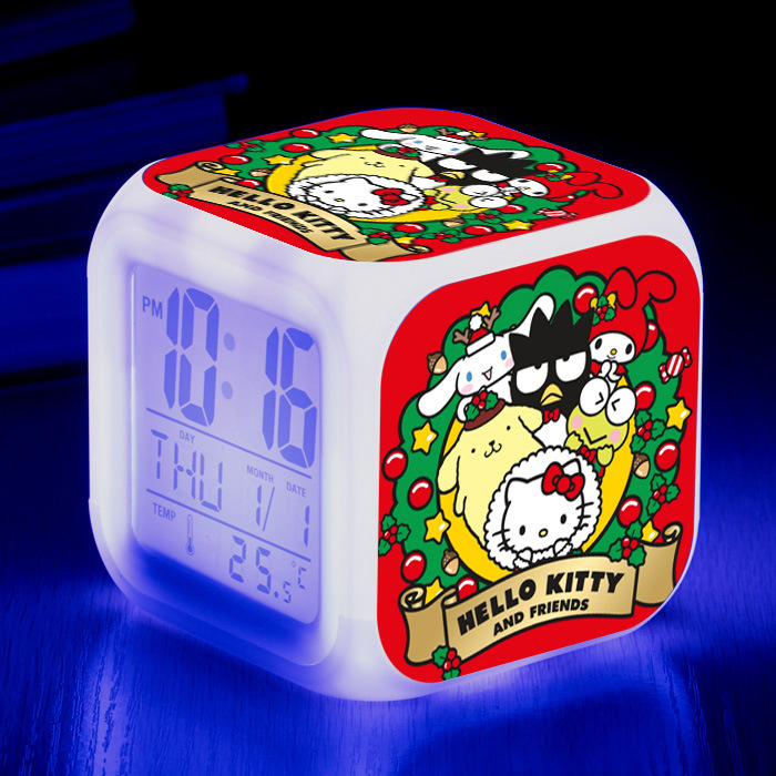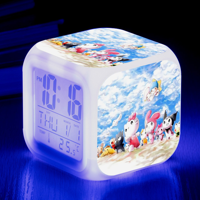 新しいサンリオの全家の福の漫画の図案の七色の変色の小さい目覚まし時計のアイデアの電子の静かな単一の四方の時計を供給します。