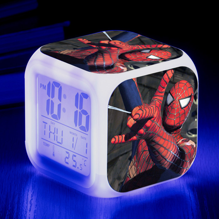 スパイダーマン周辺の模様LEDカラフルな変色四方時計大画面デジタル静音デスクトップ振り子小アラーム