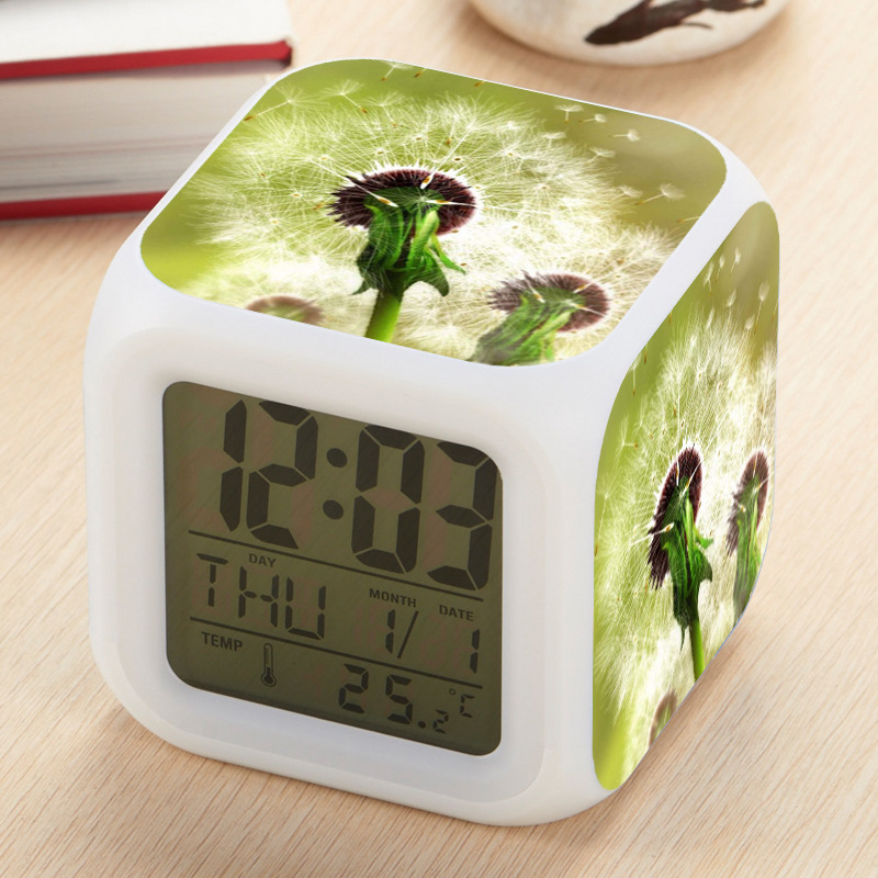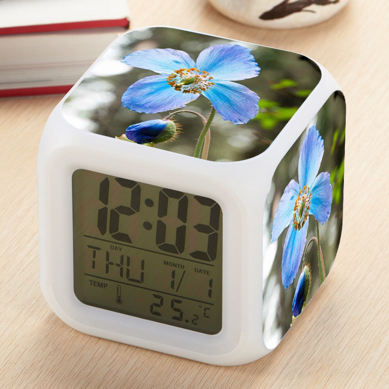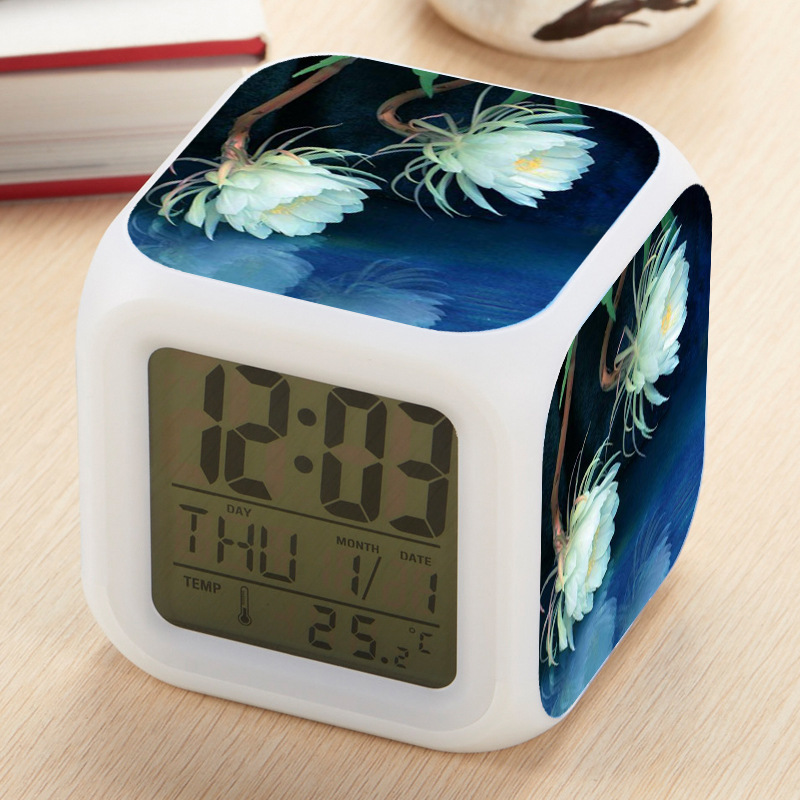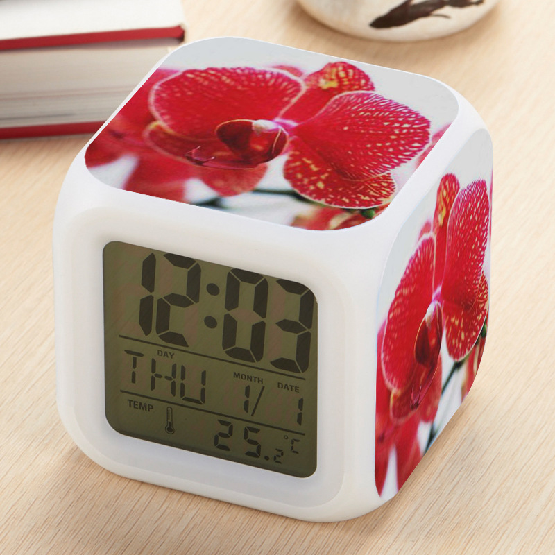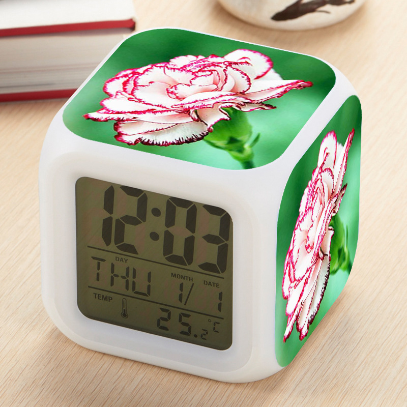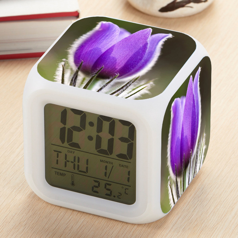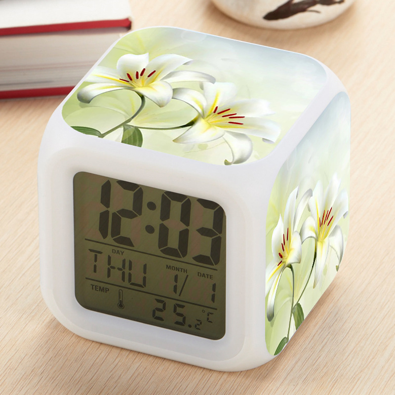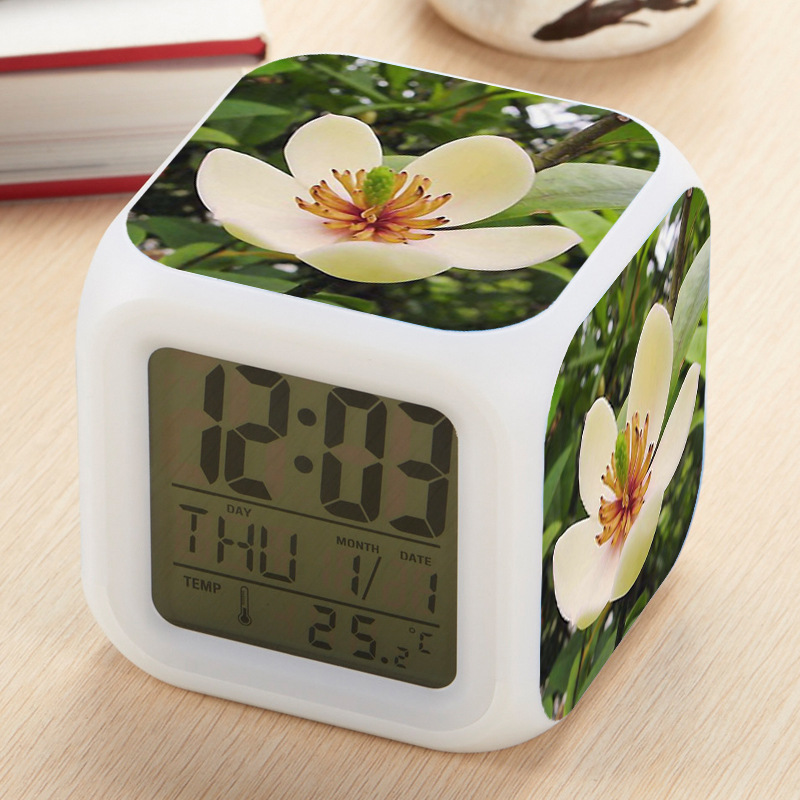 供应含笑花图案七彩变色四方钟创意桌面小闹钟
