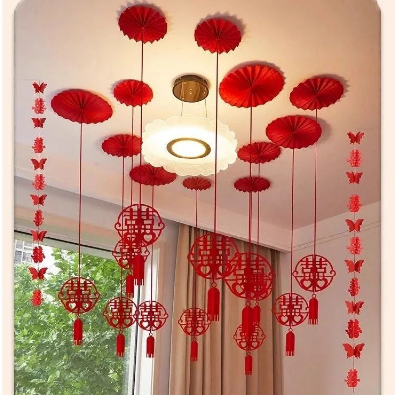 結婚式の部屋の天井のレイアウト、新郎と新婦の新しい家のリビングルームと寝室の天井のレイアウト、幸せな言葉の扇子と花の吊り下げ...