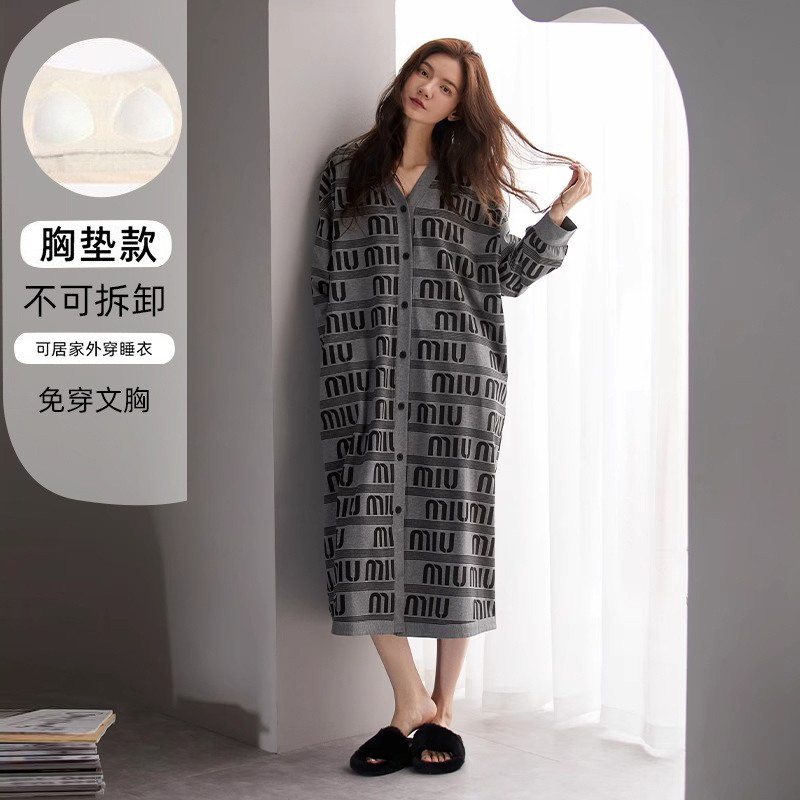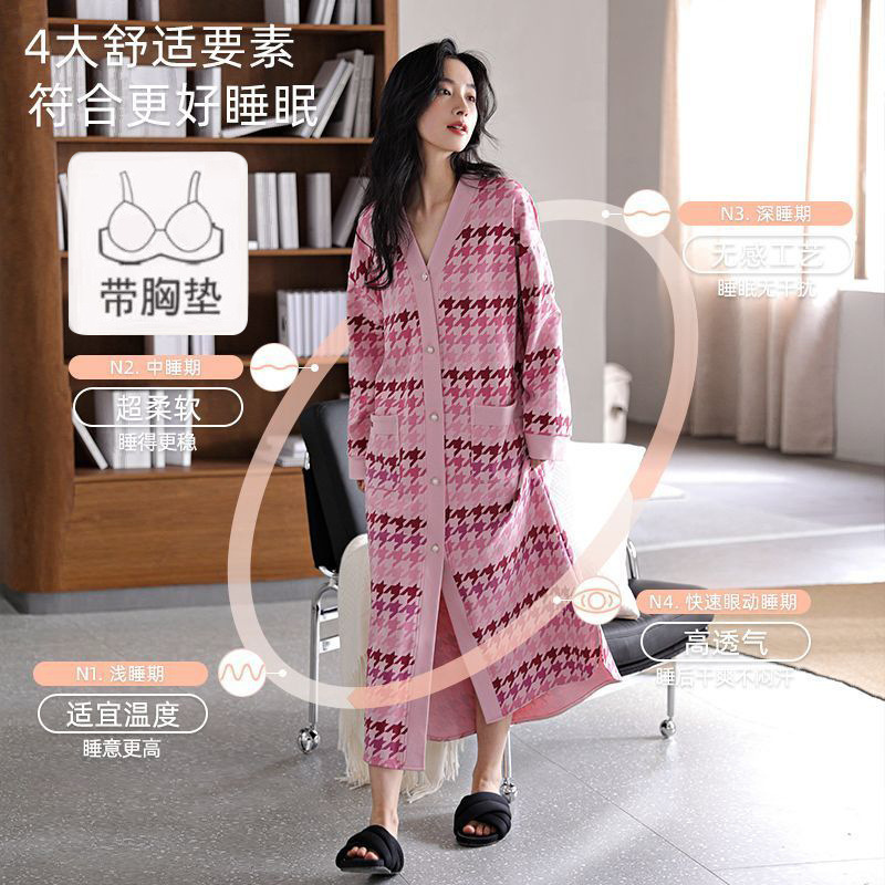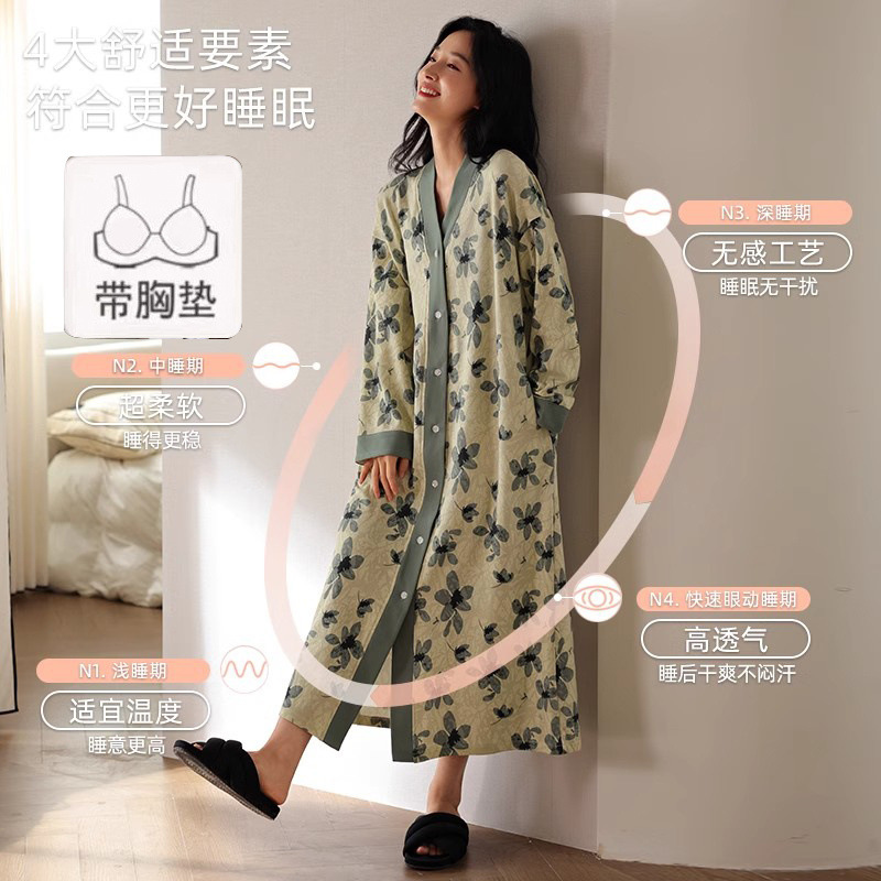 胸パッド付きのパジャマスカートの女性春と秋の100% 綿の長袖の新型カーディガンのワンピースの中の長いタイプの外は家の服を着ます。