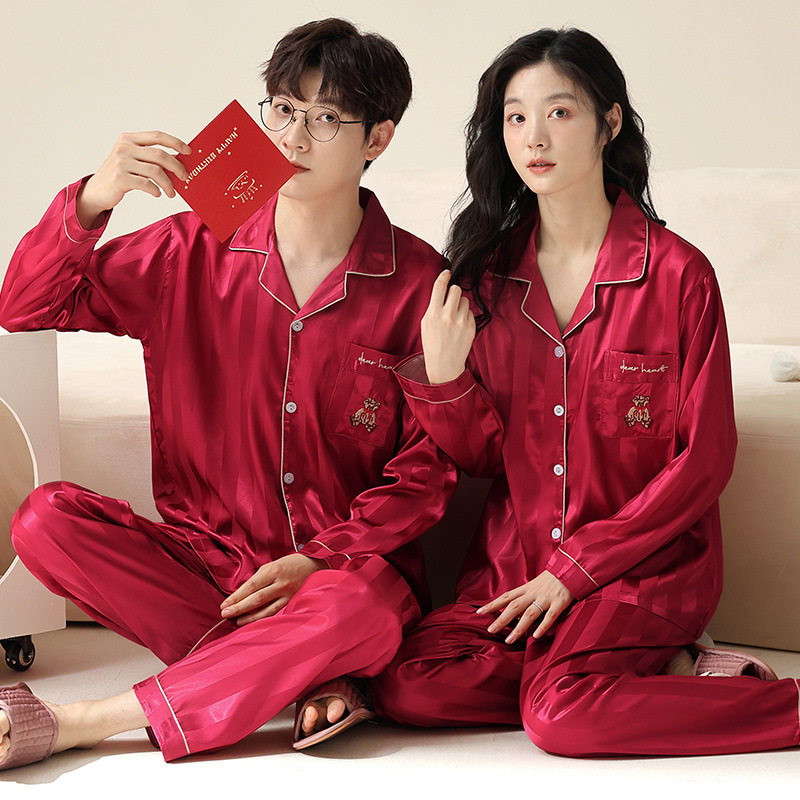 パジャマ女性春秋氷糸薄手長袖カーディガン男性カップル赤結婚祝い新婚ルームウェアセット