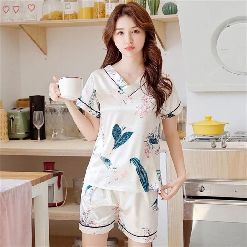 夏のパジャマの女性の氷糸夏の韓国版の清新なvネックの薄いタイプのプリントのシミュレーションのシルクのスーツは家の服を着ることができます。
