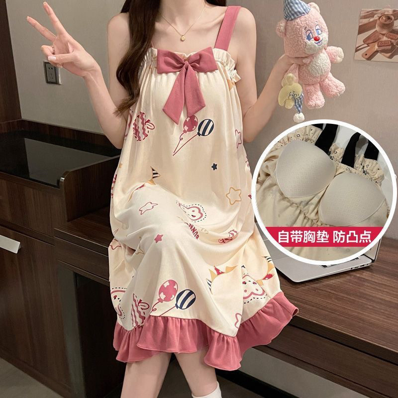 胸パッド綿のストラップ付きの寝スカートは、胸パッド付きの夏のお姫様風漫画パジャマ夏の女性は甘くて家庭服を着ています
