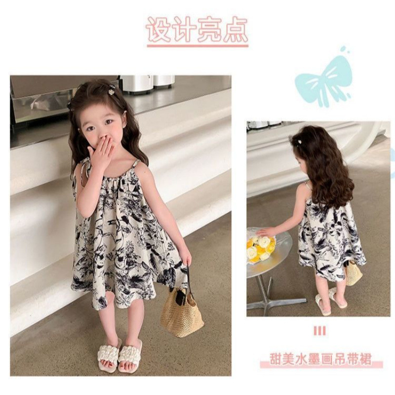 2025年夏の女の子の新しいドレス、西洋風のサスペンダーシフォンスカート、中国風のトレンディなスカート、水墨風のファッション