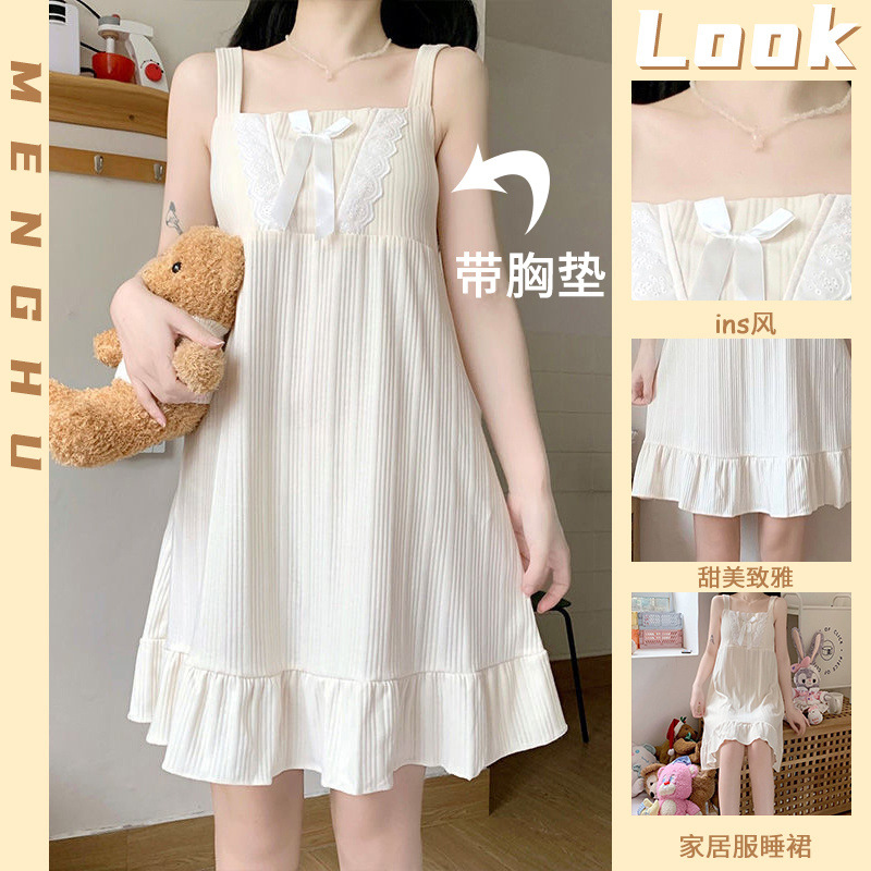 胸パッド付き夏の寝スカートの女性ストラップが甘くて可愛いです。