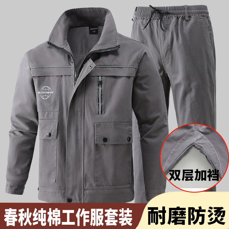 春と秋の耐磨耗と股の純綿作業服セットの男性は全セットの労働保険服の工事現場の溶接工の出勤レジャー服を厚くします。