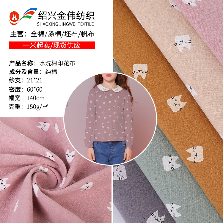 水洗い綿プリント布猫模様クレープ布ペット服生地子供服生地