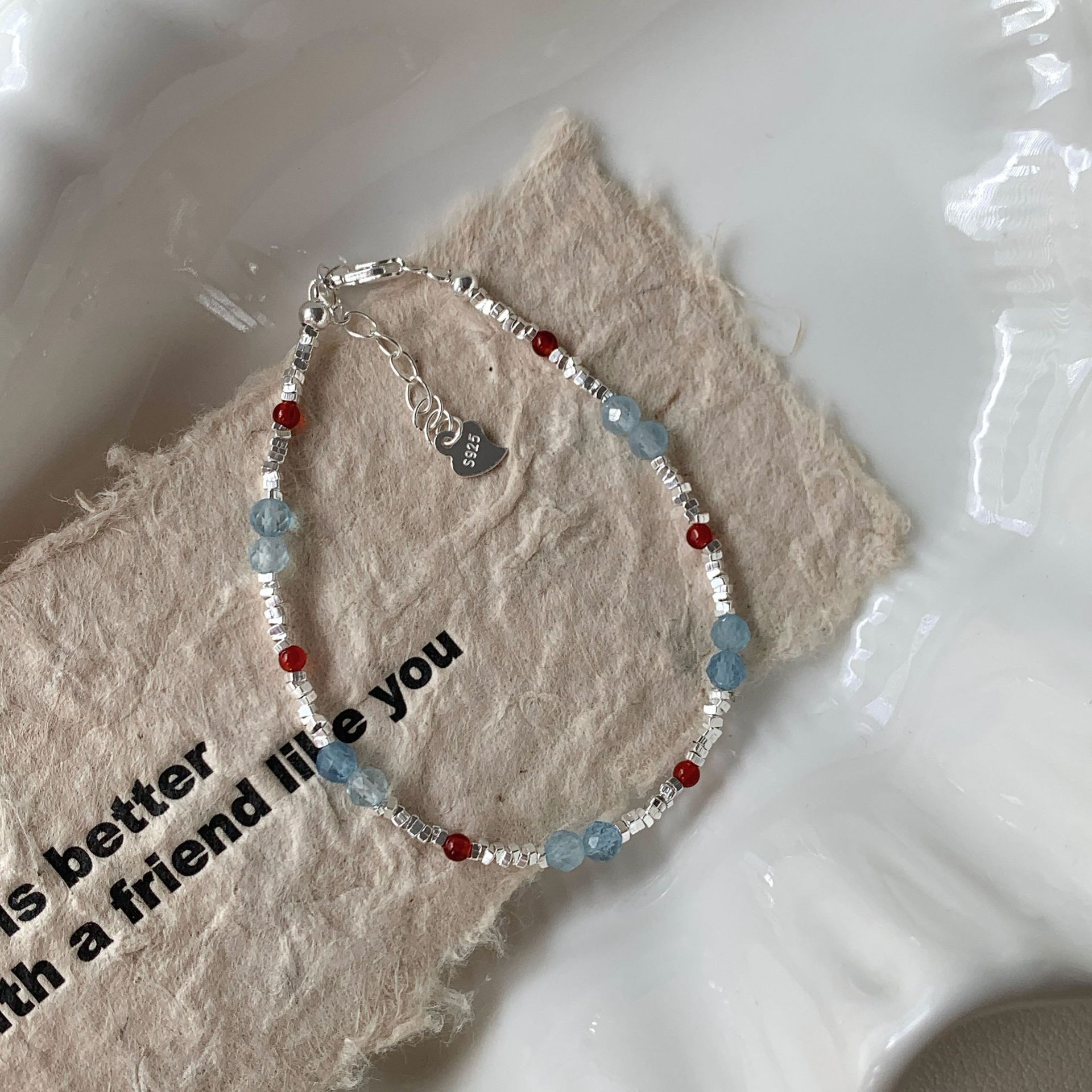 S925純銀天然アクアマリンと赤瑪瑙のブレスレット、韓国風インスタ映え、上品で人気商品