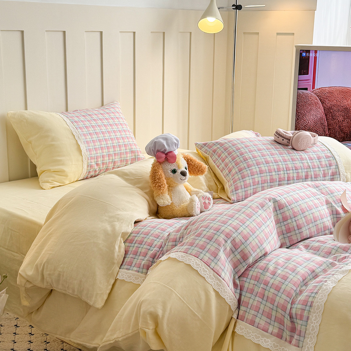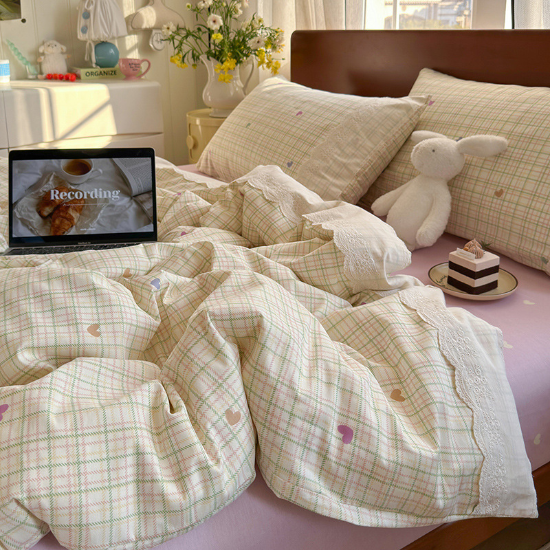 ガーリーハート綿二重糸4点セット継ぎ接ぎレース純綿100ガーゼ肌に優しい通気性のあるベッドシーツとキルトカバー