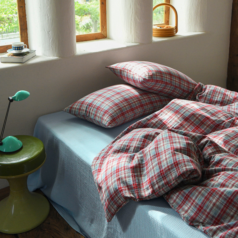 レトロスタイル綿先染め二層糸チェック柄4点セット中古純綿ガーゼ100コーマ綿ベッドシーツと掛け布団カバー