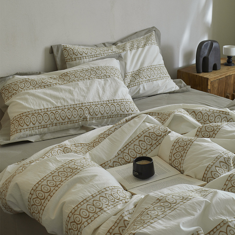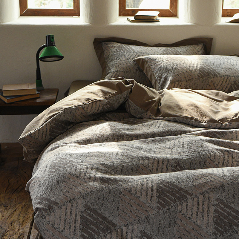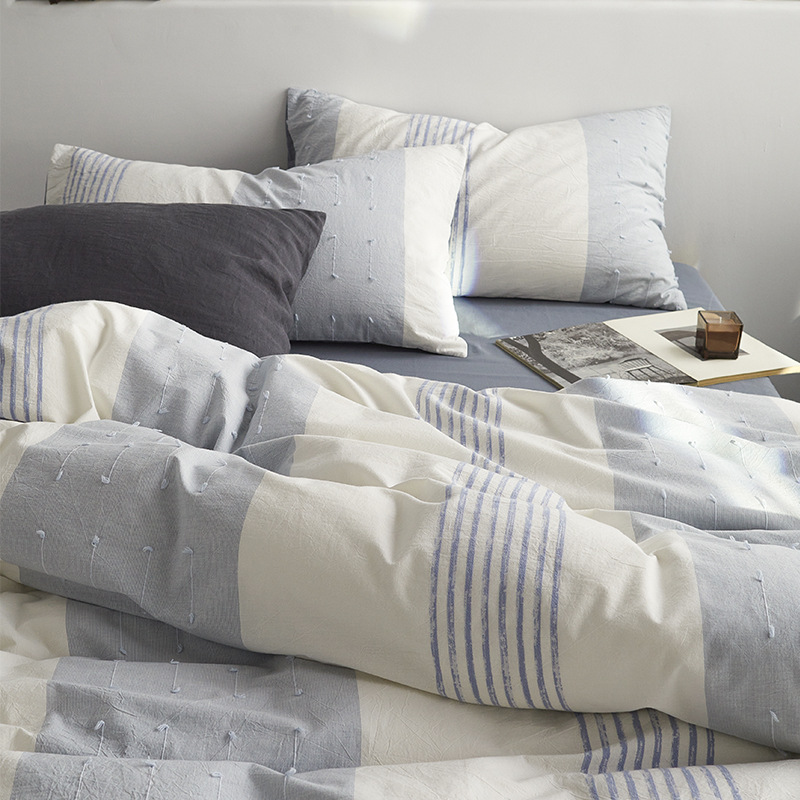 北欧風の花切り綿ジャカード四点セットの純綿シーツはシンプルなストライプの民宿寝具です。