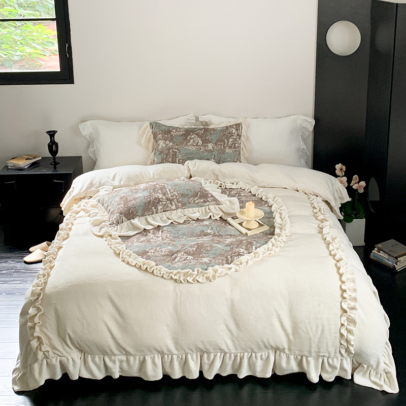フランスのレトロな冬の両面のミルクの毛の4つのセットの王女の風のレースの厚い布団のシーツのベッドの笠のベッドのスカートの金