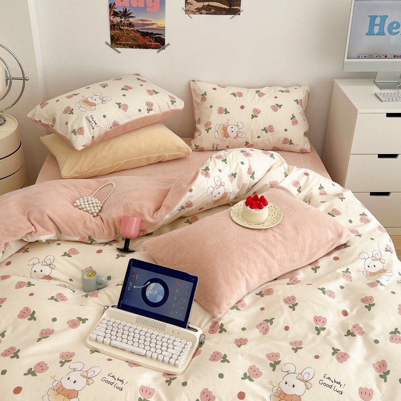 チューリップウサギのウサギの綿と毛の4セットのa面の純綿のb面の牛乳の毛の掛け布団カバーは秋冬の学生の3セットを厚くします。