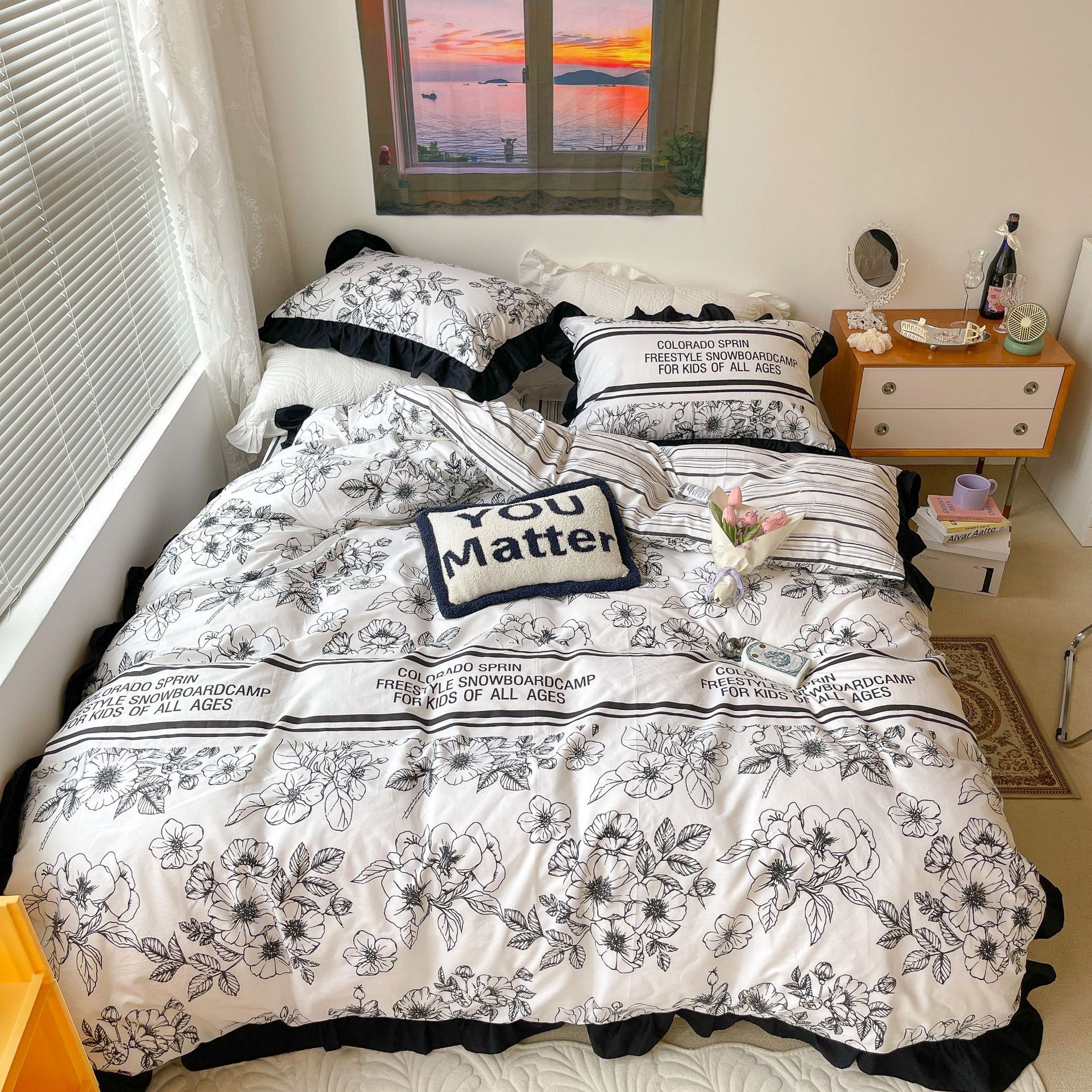 レトロ白黒全綿四点セットinsスケッチ花卉純綿フレンチレース韓国式シーツ布団セット1.5m1.8
