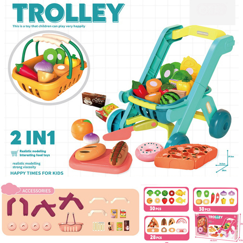 国境を越えた子供のシミュレーション手でショッピングカートを押した赤ちゃんのままごと果物野菜は台所のスーパーセットを切った
