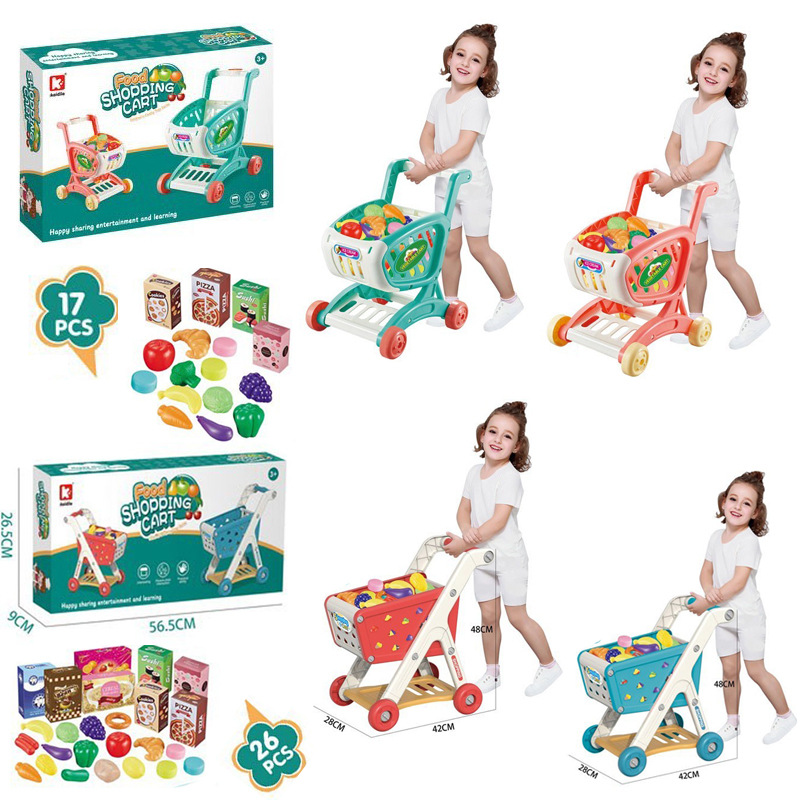 国境を越えた子供スーパーの手でショッピングカートを押した赤ちゃんは間食果物野菜のままごと玩具セットプレゼントをシミュレートした