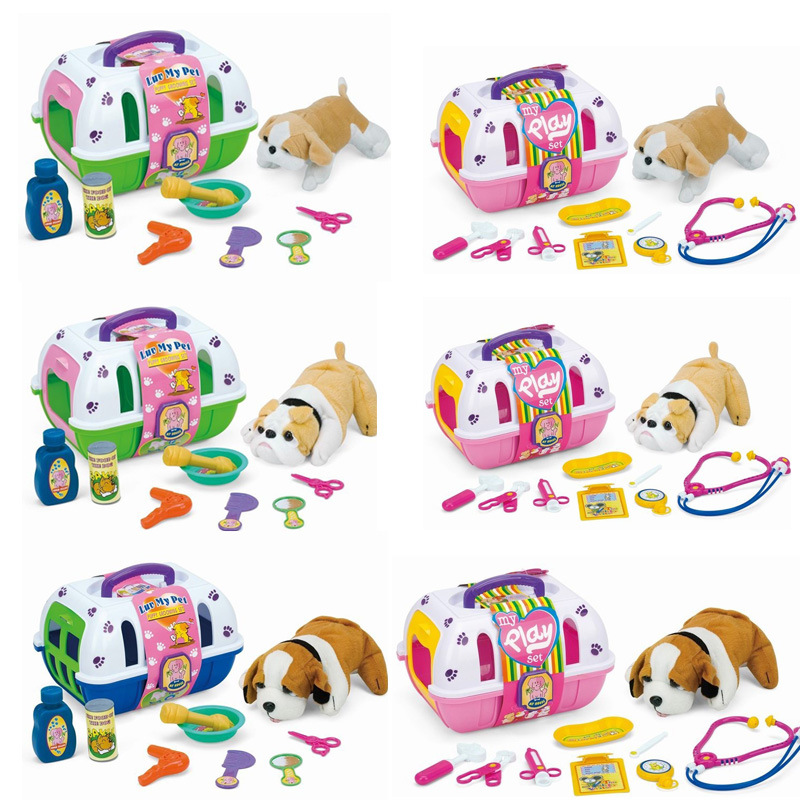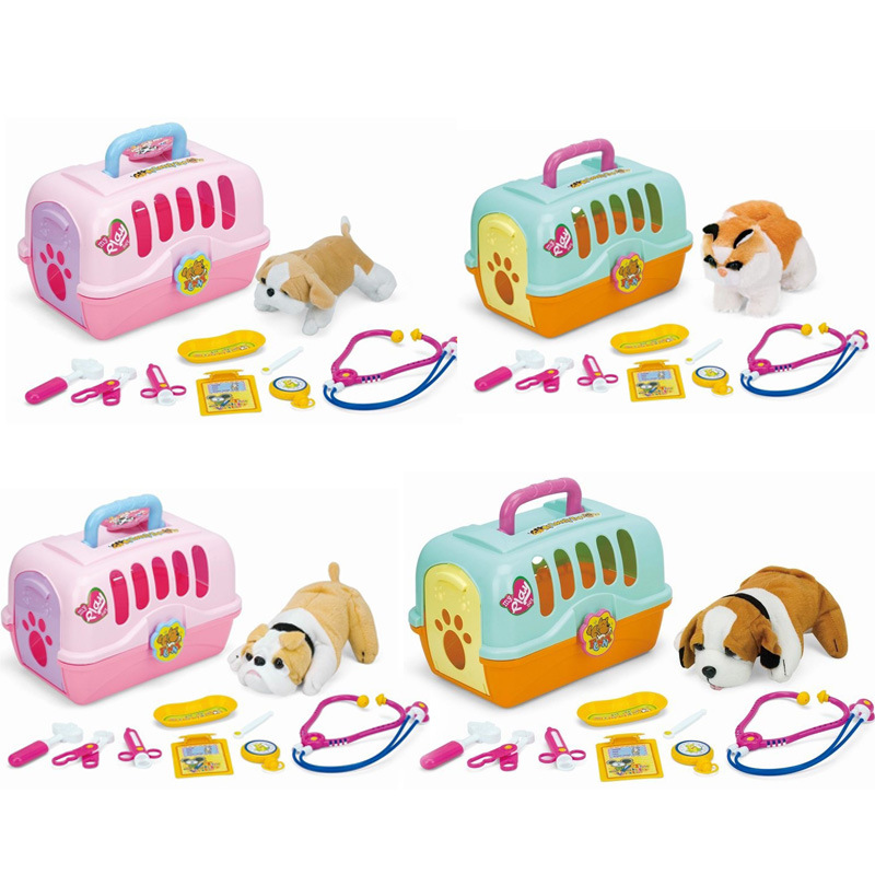 国境を越えた子供たちは、ペットケージを手にして犬の医療用品の看護玩具セットの親子交流をシミュレートする