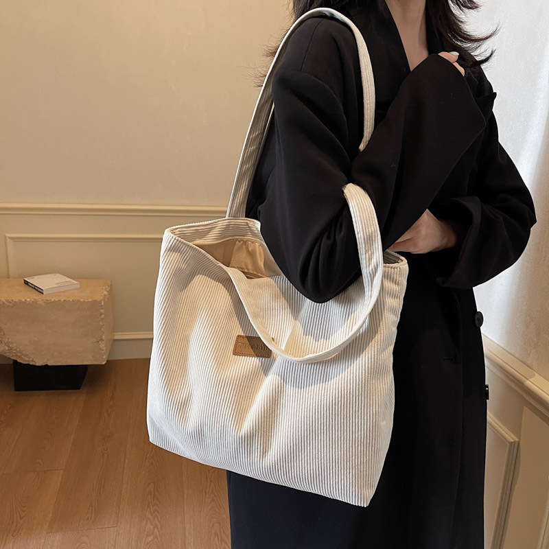カジュアルなキャンバスバッグの女性の肩が斜めになっています。