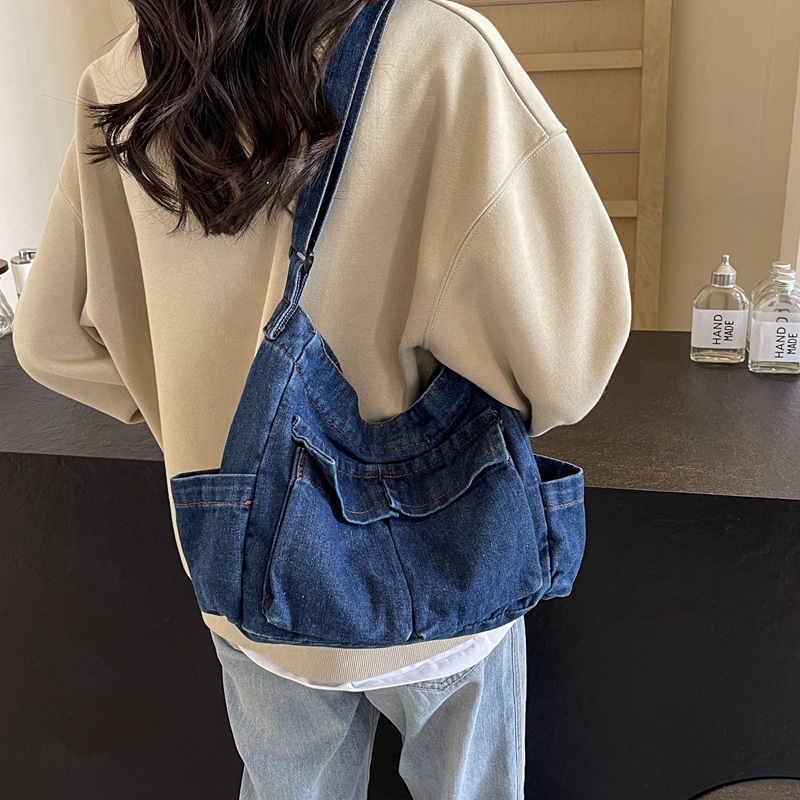 レトロ工装風女性シングルショルダーバッグinsデニムファッションと大容量文芸レジャーバッグ