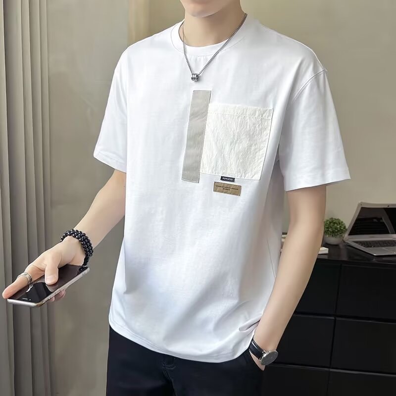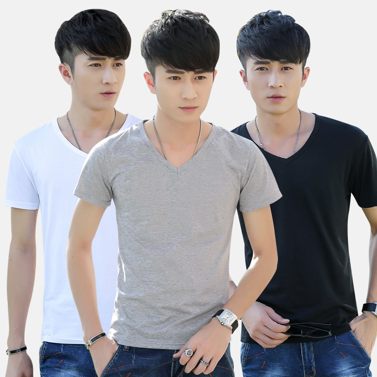 2024夏服新作純白vネックメンズ半袖tシャツメンズ半袖純色スリムシャツファッションebay