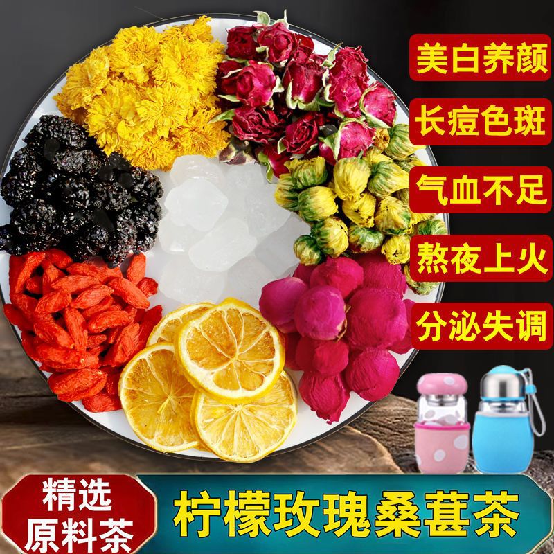 ローズティー、レモンスライス、乾燥桑の実、水に浸したクコ、夜更かし、火消し・気血・美容の組み合わせ