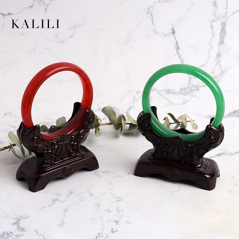ブレスレットの展示ホルダーのアクセサリーの展示棚の彫刻の小さい牛の角のブレスレットの棚は赤い木の玉の腕輪の托の道具の復古に似せます。