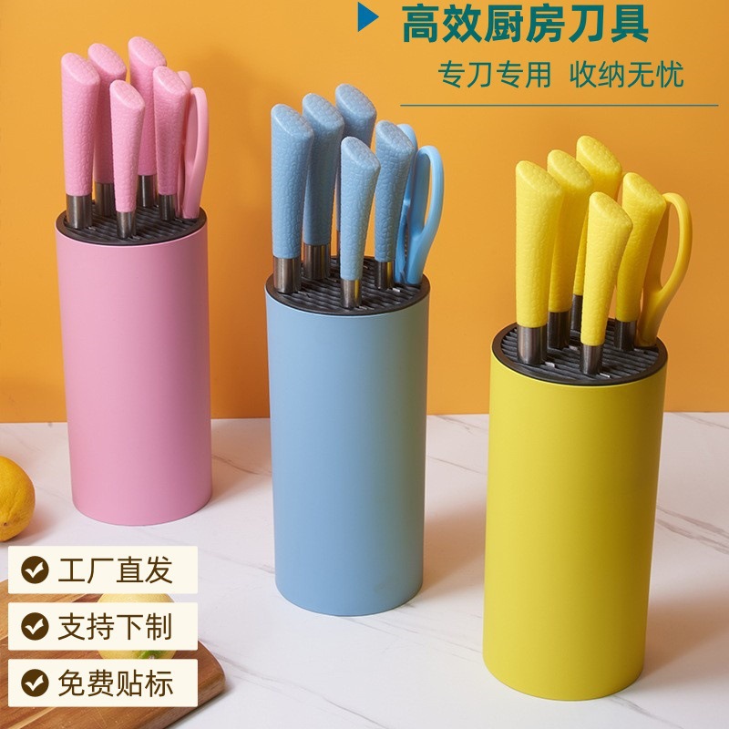 ナイフホルダー付きスポット卸売円筒形馬蹄ハンドル7点セットカラーナイフホルダーステンレス鋼包丁セット