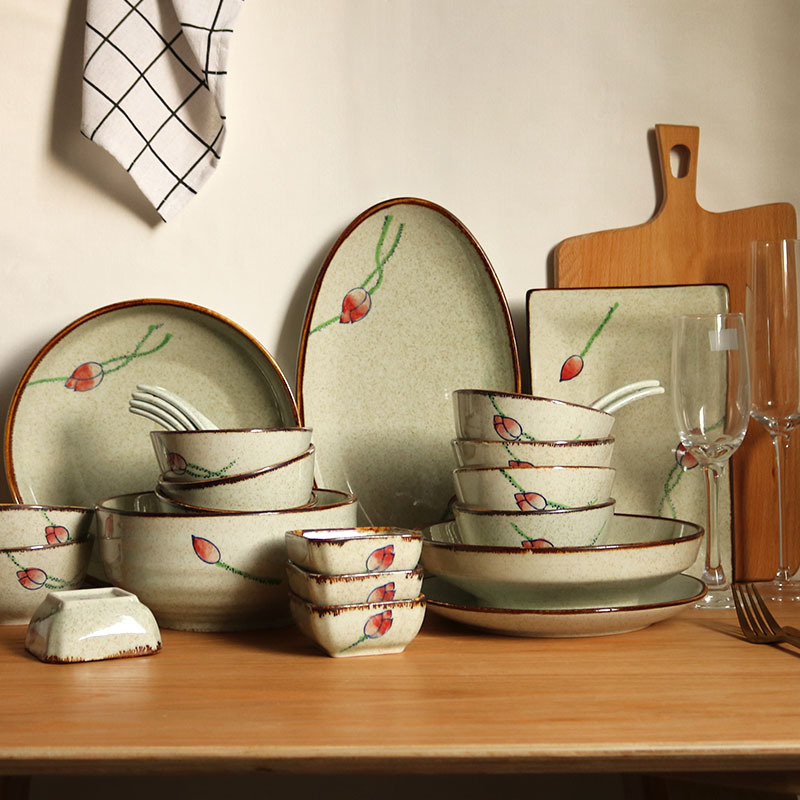 和風下絵色 6人用 多人数用セット 陶器食器 ボウルと箸 家庭用食器 丼 ディナープレート スープボウルセット