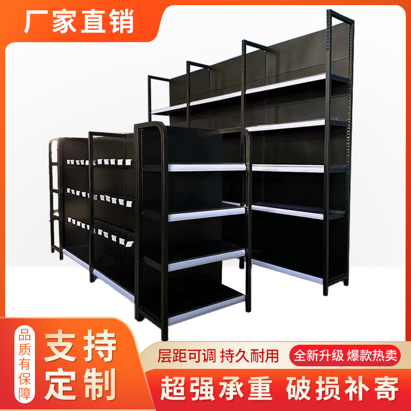 スーパーマーケットの棚ディスプレイスタンド新鮮な新つや消し黒コンビニ母子スナック商品片面 4 柱幅